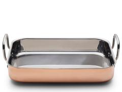 Tidlös, elegant och mycket funktionell stekpanna i koppar och rostfritt stål. Ugnspannan är utrustad med handtag i rostfritt stål. Tål ugnstemperatur upp till 220°C. Handtvätt med mjuk borste och tvål rekommenderas. Använd kopparpolish för att hålla utsidan blank. Kopparkokkärl diskas för hand med varmt vatten och diskmedel. Om du föredrar blankputsad koppar eller en mer patinerad look är en smaksak. Vi rekommenderar att du putsar dina kopparkokkärl före användning och upprepar putsningen några gånger om året så att kärlen håller sig blanka och fina. Utan putsning kommer koppar med tiden att få en naturlig matt yta med ett mindre polerat utseende. Om dina kopparkärl blir mycket orangegula, kan det bero på att kopparn reagerar med luftfuktigheten i omgivningen. Allt du behöver göra för att kopparn ska bli fin igen är att putsa den.