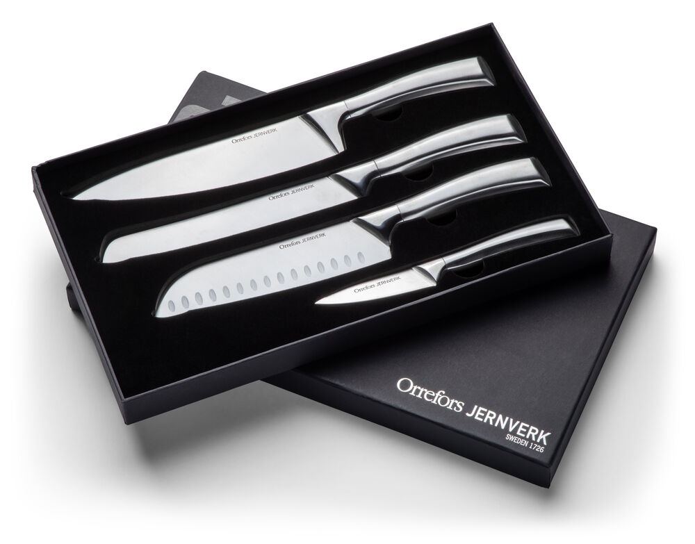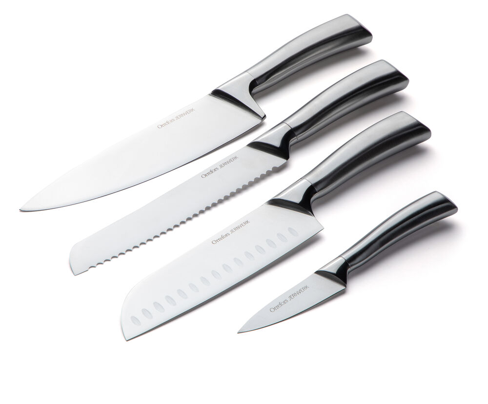 Knivset i rostfritt stål bestående av Kockkniv bladlängd 20 cm, Brödkniv 20 cm Santokukniv 18 cm Skalkniv 9 cm