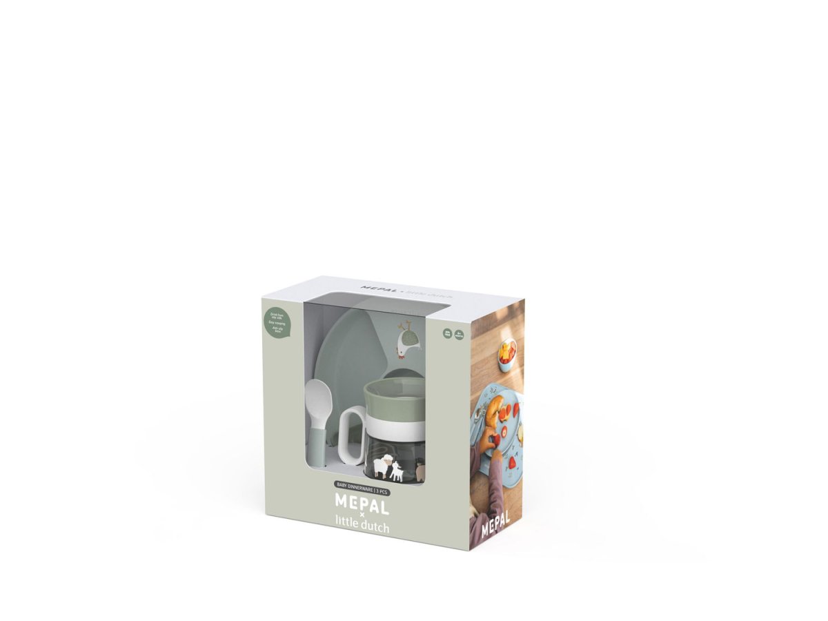 Mio nybörjarset för små barn som ska lära sig att äta och dricka själva. Setet består av en barntallrik med indelning, en barnmugg 200 ml och en sked. Tål maskindisk. Från ca 6 månader. Med Mio barntallrik slipper du att maten körs runt i cirklar på tallriken. Tallriken har en hög kant och en praktisk form som för maten in i ett hörn, där den enkelt fångas upp med den smarta och robusta Mio barnskeden med bra grepp på det korta handtaget. Formen ger också ett smart grepp som du kan hålla i när du matar barnet – och som barnet själv kan hålla i när det äter på egen hand. Med halkskydd på undersidan står tallriken stadigt på bordet. Ska maten värmas snabbt är det bara att sätta tallriken i mikrovågsugnen. En flyttbar och avtagbar insats medföljer så att tallriken kan delas in i 2, 3 eller 4 sektioner. Diameter: 20 cm. Höjd: 2,7 cm. PP och TPE. Mio barnmugg 200 ml är perfekt när barnet ska lära sig dricka ur en vanlig mugg. Barnet kan dricka runt hela kanten, och det genomskinliga locket doserar vätskan så att det inte kommer allt på en gång. De stora handtagen gör det enkelt för små händer att hålla i muggen. Robust, hygienisk och 100 % läckagesäker. När barnet är redo att dricka utan lock tas det enkelt bort. Muggen är lätt att ta isär och rengöra, och alla delar kan köras i diskmaskin. Den genomskinliga plastbehållaren gör det lätt att se hur mycket vätska som finns kvar. Tritan, PP och silikon. Mepal Mio är en hel kollektion av smarta pipmuggar, tallrikar och bestick som gör det enkelt för små barn att lära sig äta och dricka själva i takt med att de växer och får fler och fler färdigheter. Varje produkt har specifika funktionella egenskaper som är anpassade efter barnets ålder och utveckling. Produkterna är tillverkade av Tritan, PP, TEP, SAN och rostfritt stål och har ett tydligt designspråk med moderna färger.