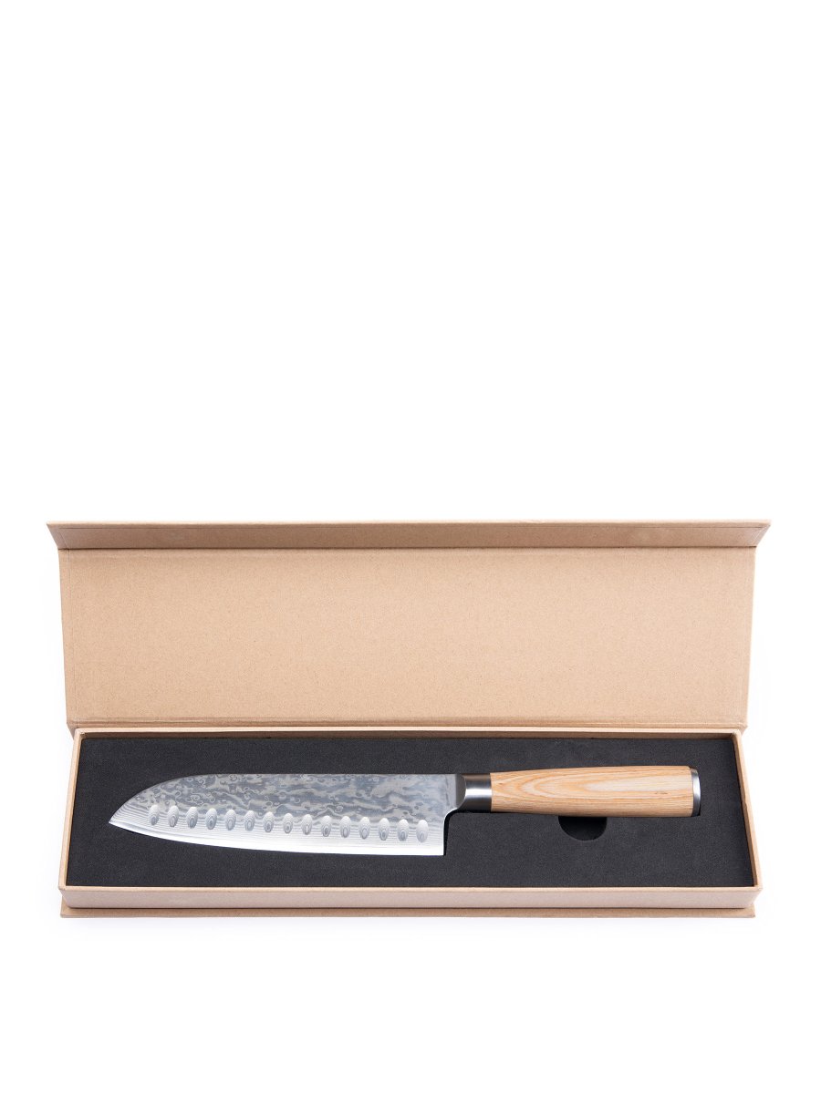 Denna santokukniv är den mest mångsidiga kniven. Skivor från råvarorna fastnar inte på bladet, och skärandet går genast snabbare och smidigare. Det stabila skaftet i pakkaträ är ergonomiskt utformat, vilket gör kniven till ett rent nöje att arbeta med. Komforten gör att du kan arbeta med kniven länge utan att bli trött i handen. Knivbladet har en otroligt hård kärna av VG10 stål, som är ingjutet i 67 lager stål. Resultatet av detta är ett hållbart blad med otrolig skärpa och enastående skärförmåga. Enbart handdisk.