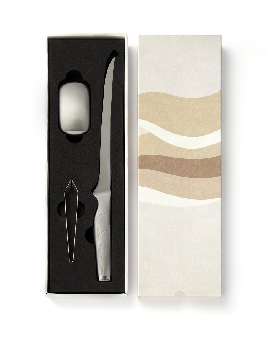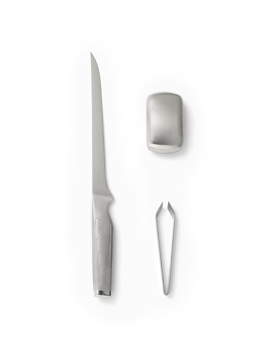 Filékniv tillverkad av högkvalitativt japanskt 420J-stål. Filékniven har ett långt, tunt och flexibelt blad - perfekt för exakta snitt. Du kan använda kniven till exempel för att filea fisk eller skära skinka. Setet kommer med metalltvål som avlägsnar lukter som fisk och vitlök. Lådan innehåller också en pincett för att ta bort små ben från fisk. Den perfekta gåvan för matlagningsentusiaster.