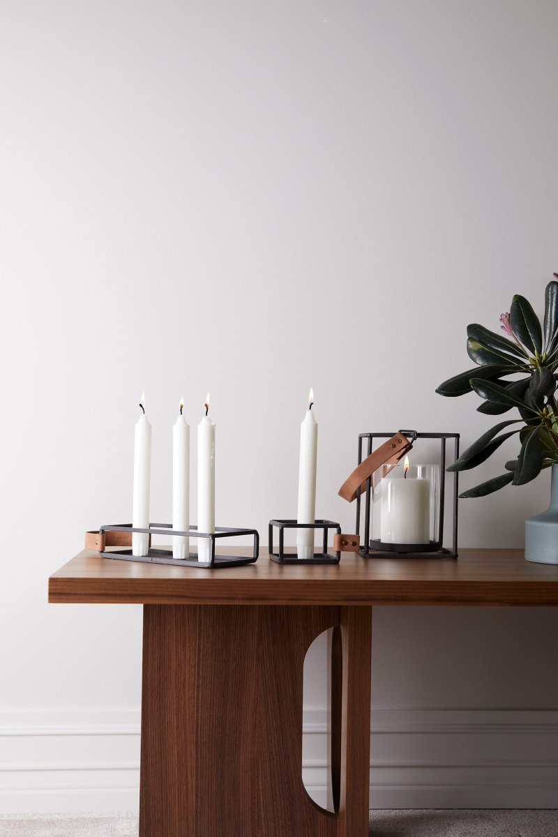 Ljuslykta i en industriinspirerad design med raka linjer. Ett handtag i mjukt konstläder blir en fin och praktisk detalj på lyktan som i övrigt består av enkla stålprofiler och en glascylinder.