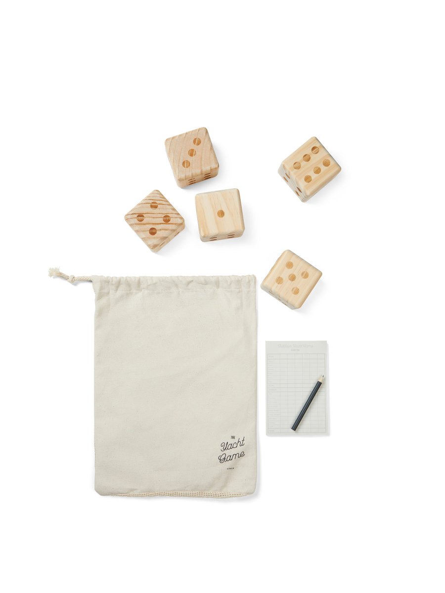 Outdoor yacht game, det klassiska tärningspelet som passar perfekt för härliga utomhusdagar. Målet med spelet är att få högsta möjliga poäng genom att kasta och kombinera tärningarna på olika sätt. Spelet består av 5 st täningar med mått 7x7x7 cm samt anteckningsblock med penna. Spelet levereras i en bomullspåse, vilket gör det enkelt att bära med sig. Bruksanvisning ingår. Tärningarna är tillverkade av högkvalitativt FSC 100® certifierat furuträ, vilket innebär att träet kommer från ansvarsfullt skötta skogar.