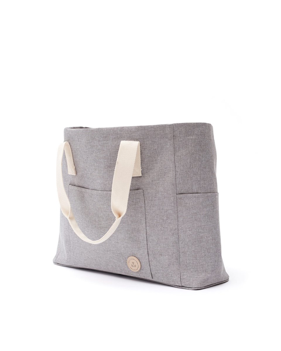 Den här stilrena strandväskan kommer utan tvekan förenkla dina dagar på stranden. Väskan är försedd med praktiska dubbla bärhandtag. Strandväskan är rymlig och har smarta fack. Detta i form av ett mindre fack på insidan med dragkedja som lämpar sig för värdesaker, och tre mindre fack på utsidan som kan förvara sådant som kräver enkel tillgång. Väskan är lätt att torka av och de snygga detaljerna i bomull och konstläder ger strandväskan lite extra elegans.